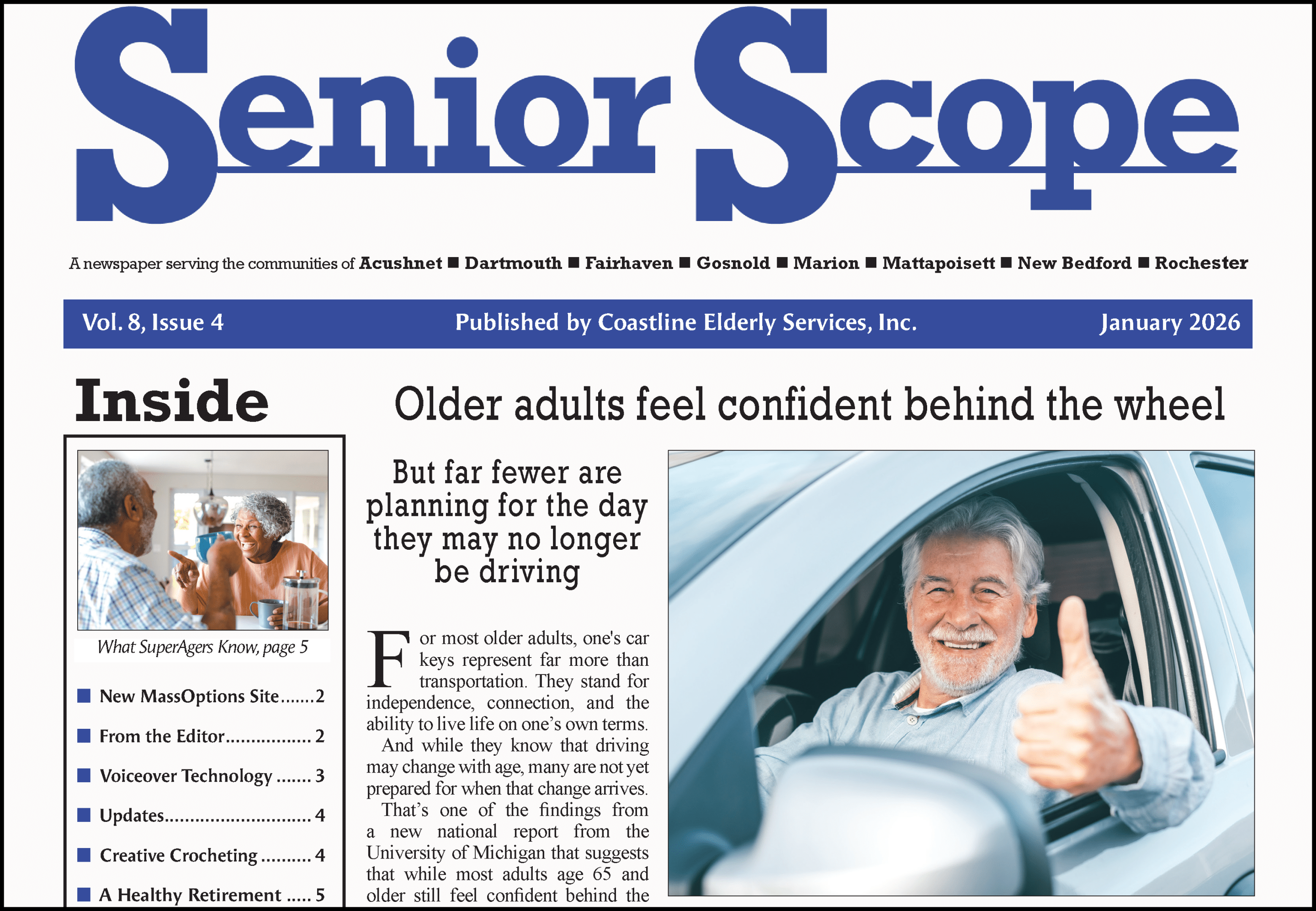 Would you like Senior Scope delivered to your door? You can subscribe to the print edition of Senior Scope for one year (10 issues) for $18. Checks can be mailed to Coastline, 863 Belleville Ave., New Bedford, MA 02745. Checks can be paid to the order of “Coastline.” We cannot process checks made out to “Senior Scope.”